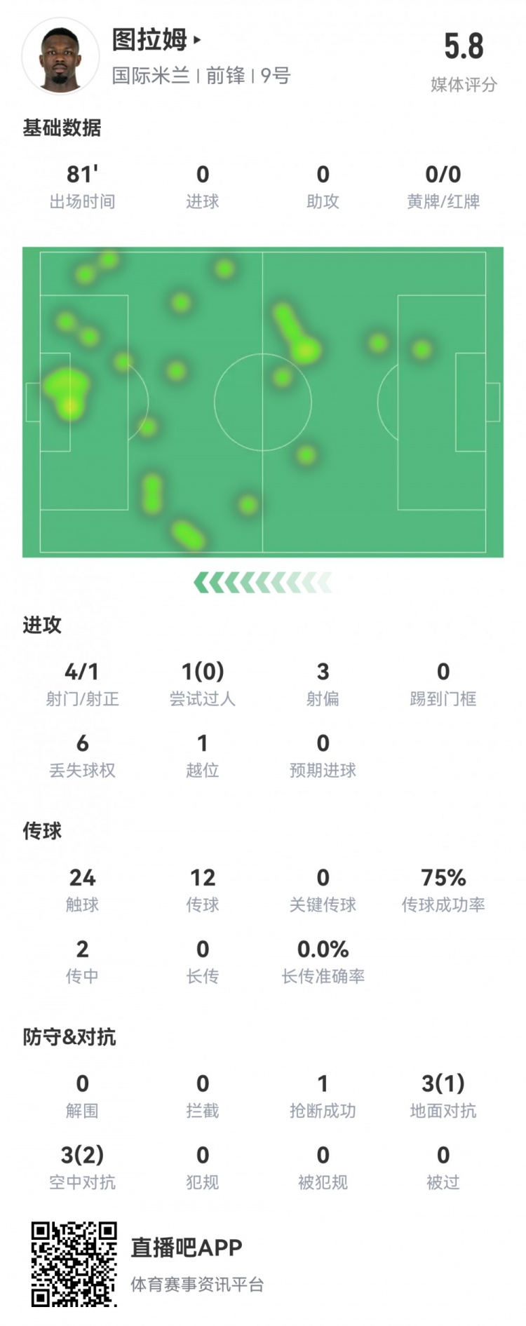1月23日讯 正在进行的意超杯决赛,那不勒斯暂0-0国米。小图拉姆首发出战81分钟多次错失良机,球员全场重点数据如下↓