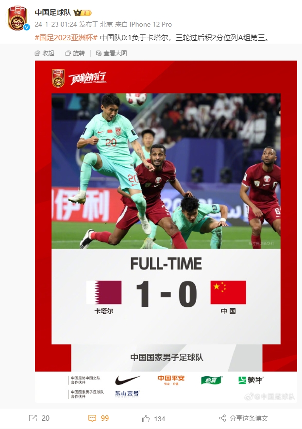 01月23日讯 国足官号“中国足球队”发布了国足本场战报,文字非常简短。评论区直接炸锅