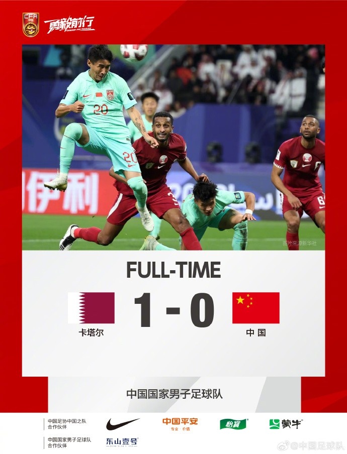 中国队0:1负于卡塔尔,三轮过后积2分位列A组第三。
