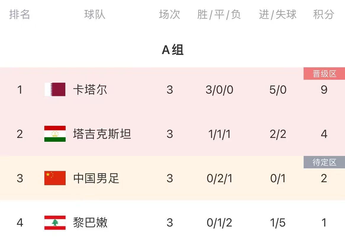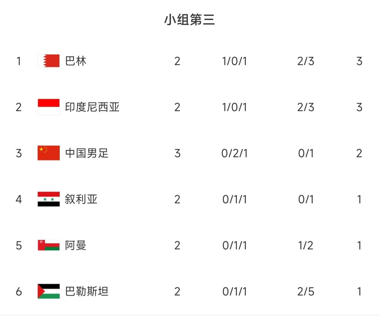 0球0胜国足小组赛2平1负,位列小组第三出线仅剩理论可能