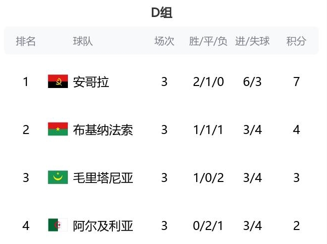 本届非洲杯,每个小组的前二和四个成绩最好的小组第三将获得出线资格,因此D组三支球队安哥拉、布基纳法索、毛里塔尼亚均晋级淘汰赛,只有阿尔及利亚出局。