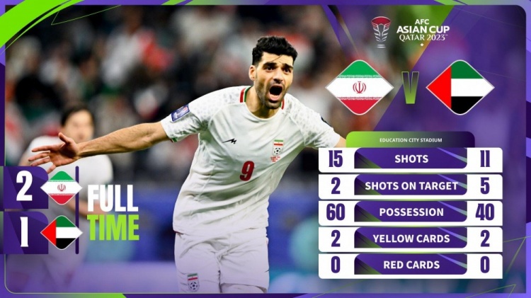 亚洲杯C组第3轮,伊朗2-1击败阿联酋。伊朗三连胜头名出线,淘汰赛将战B组第三叙利亚;阿联酋4分凭借净胜球优势排名小组第2晋级,淘汰赛对阵A组第2塔吉克斯坦。