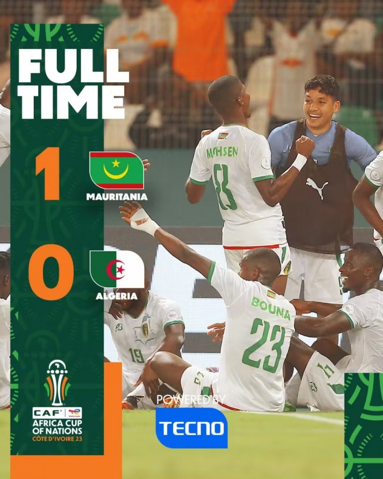 非洲杯D组第3轮,毛里塔尼亚1-0击败阿尔及利亚,阿尔及利亚小组赛2平1负垫底出局。
