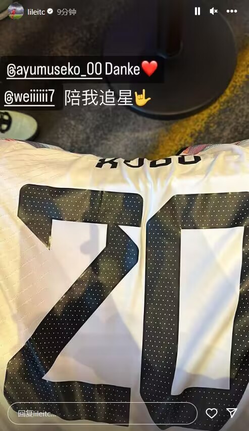 1月24日讯 日前,中国男足后卫李磊在ins上晒出了一件久保建英的国家队球衣,并写道:“@濑古步梦 谢谢❤️ @韦世豪 陪我追星”
