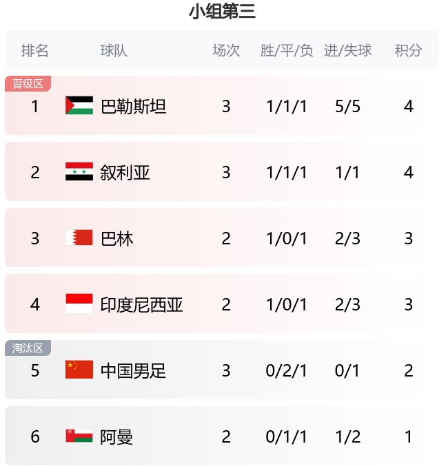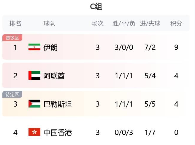积分榜方面,伊朗3连胜头名出线,阿联酋第2出线,巴勒斯坦第3出线,中国香港0分垫底出局。