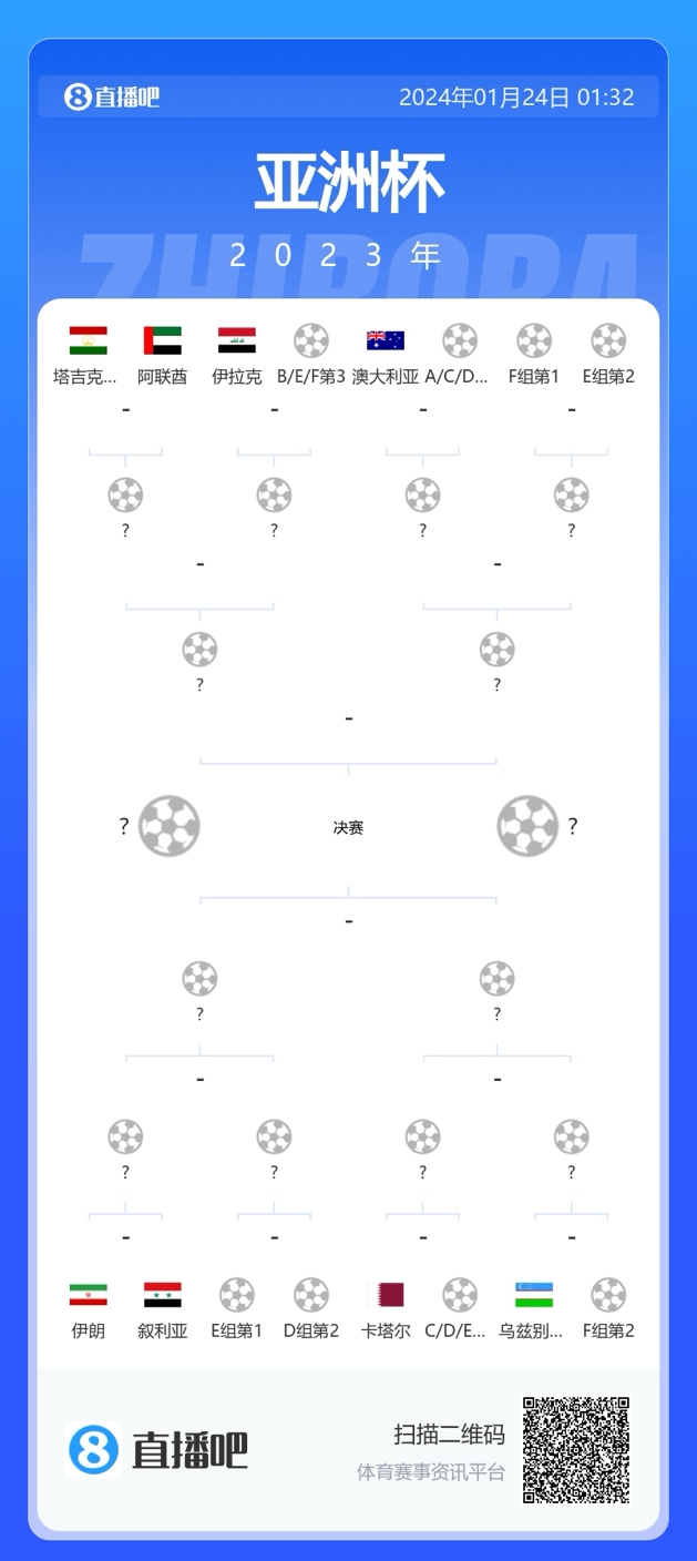 01月24日讯 亚洲杯B组、C组收官,目前16强淘汰赛对阵已确定两组,分别是A组第二塔吉克斯坦vsC组第二阿联酋,C组第一伊朗vsB组第三叙利亚。