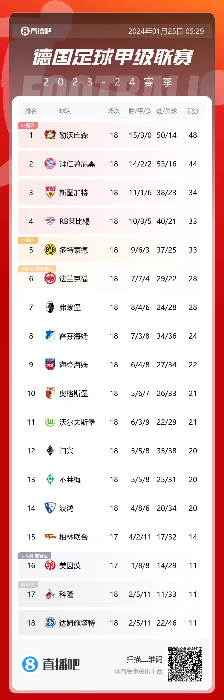 最新德甲积分榜: