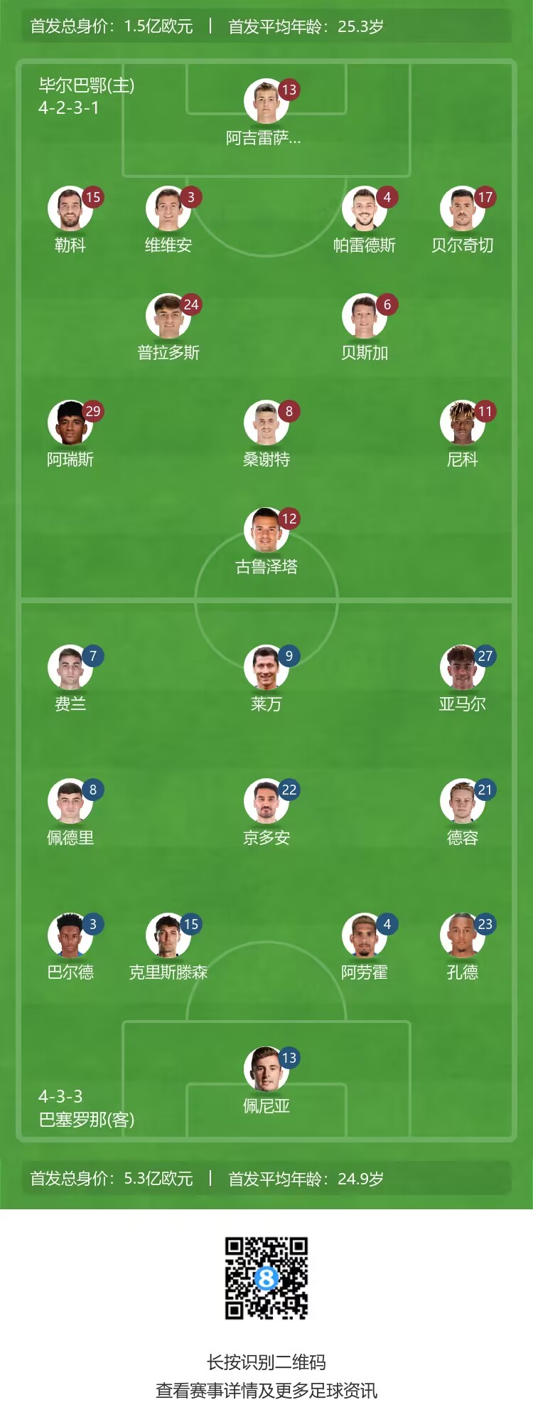 巴萨首发:13-佩尼亚、23-孔德、4-阿劳霍、15-克里斯滕森、3-巴尔德、21-德容、22-京多安、8-佩德里、7-费兰-托雷斯、27-亚马尔、9-莱万