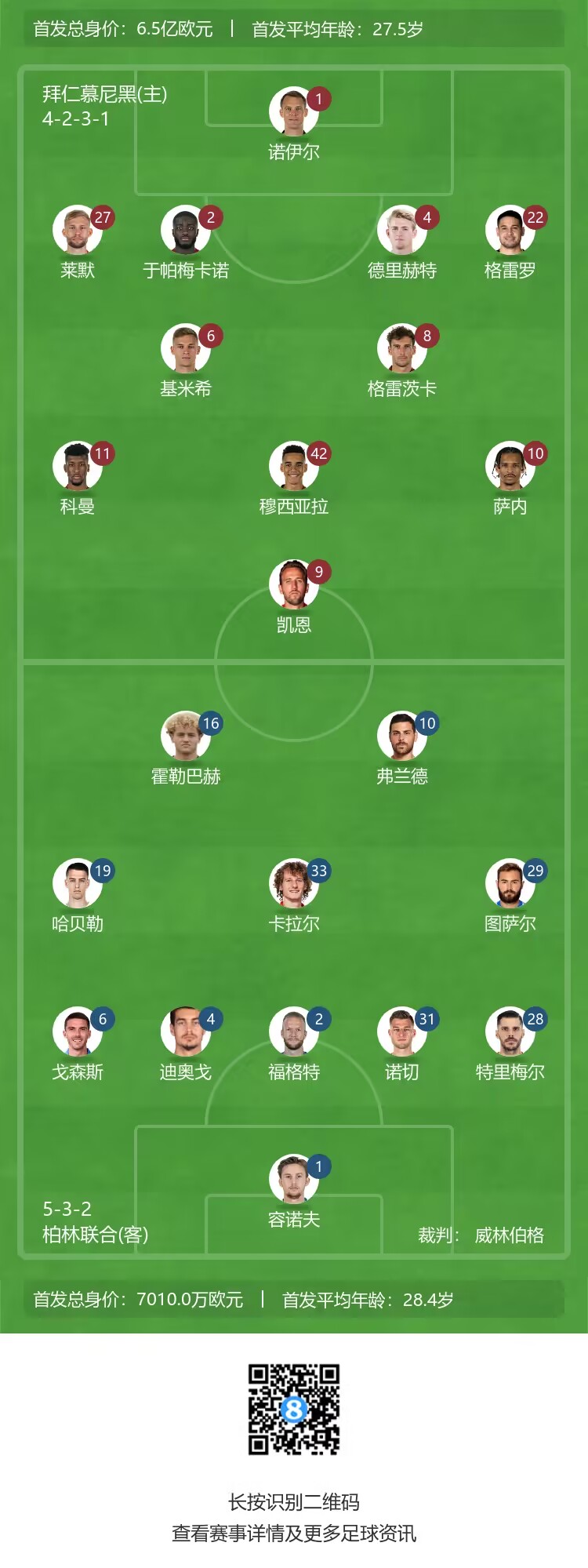 拜仁首发:1-诺伊尔、27-莱默尔、2-于帕梅卡诺、4-德里赫特、22-格雷罗、6-基米希、8-格雷茨卡、42-穆西亚拉、10-萨内、11-科曼、9-凯恩