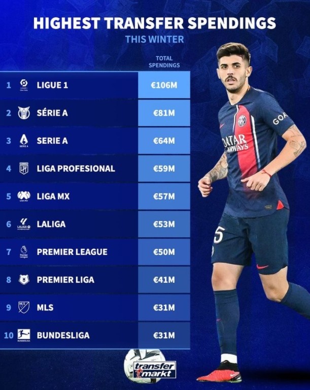 德转列冬窗各联赛支出榜:法甲超1亿欧居首,英超5000万欧第7