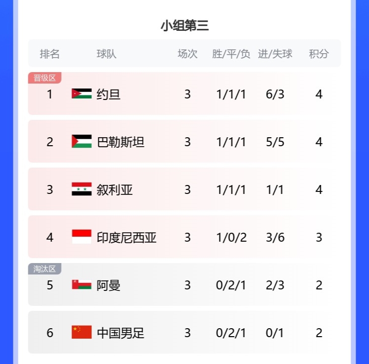 周四晚间进行的F组末轮比赛,吉尔吉斯斯坦在第80分钟进球,最终以1-1的比分战平阿曼,这场平局让阿曼积2分排名F组第三,因此落后于D组排名第三积3分的印尼队。