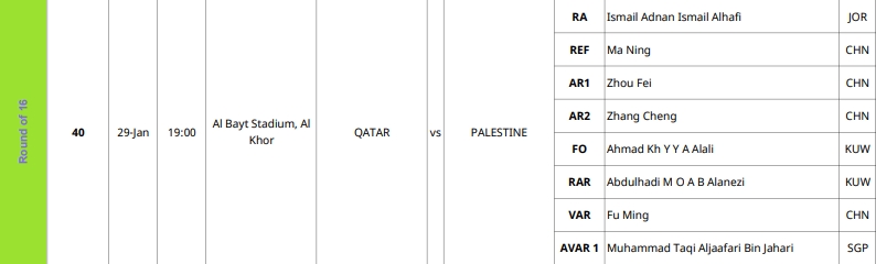 北京时间1月30日0点,亚洲杯1/8决赛,卡塔尔将对阵巴勒斯坦,具体裁判安排: