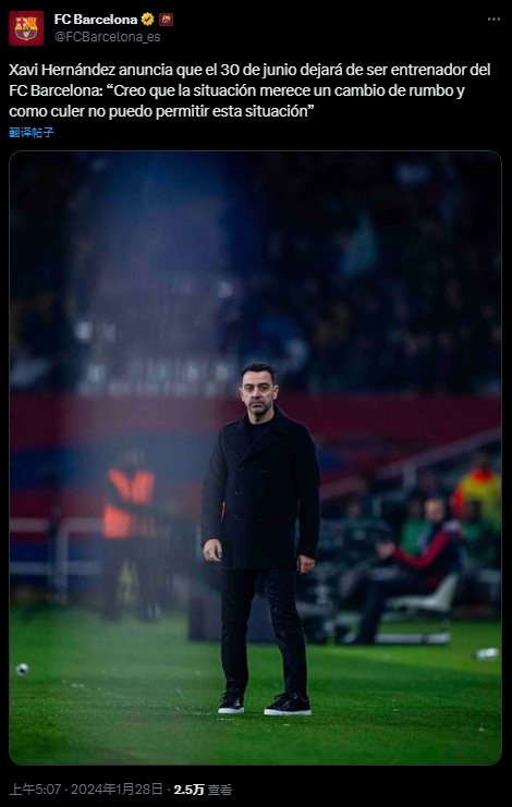 巴萨官方:哈维-埃尔南德斯宣布,他将于6月30日起不再担任巴萨主教练一职。