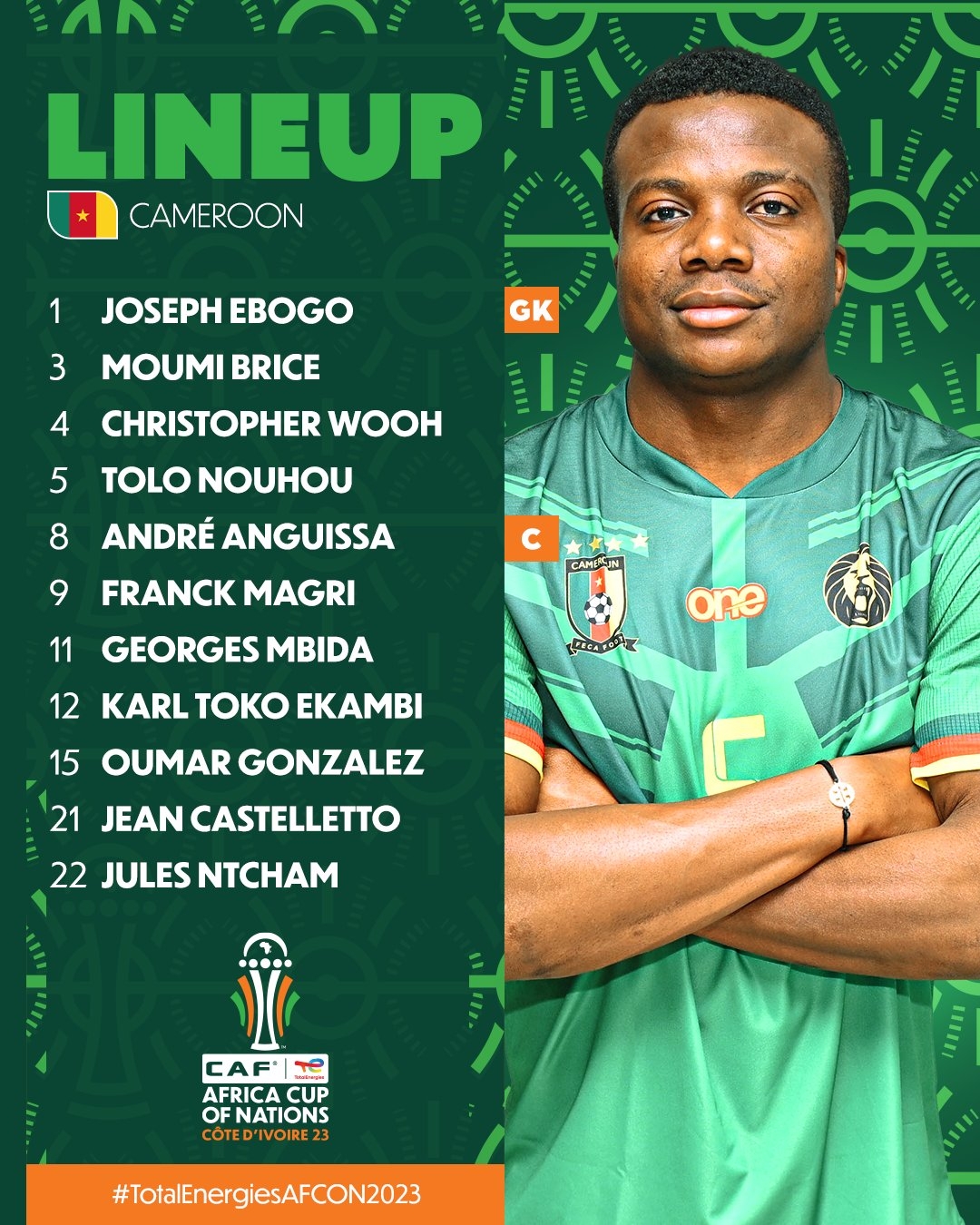 喀麦隆首发:1-昂多亚、21-卡斯特略托、4-克里斯托弗-伍、3-恩加马勒乌、5-图洛、15-冈萨雷斯、22-恩查姆、8-安古伊萨、12-埃卡姆比、11-恩库杜、9-马格里