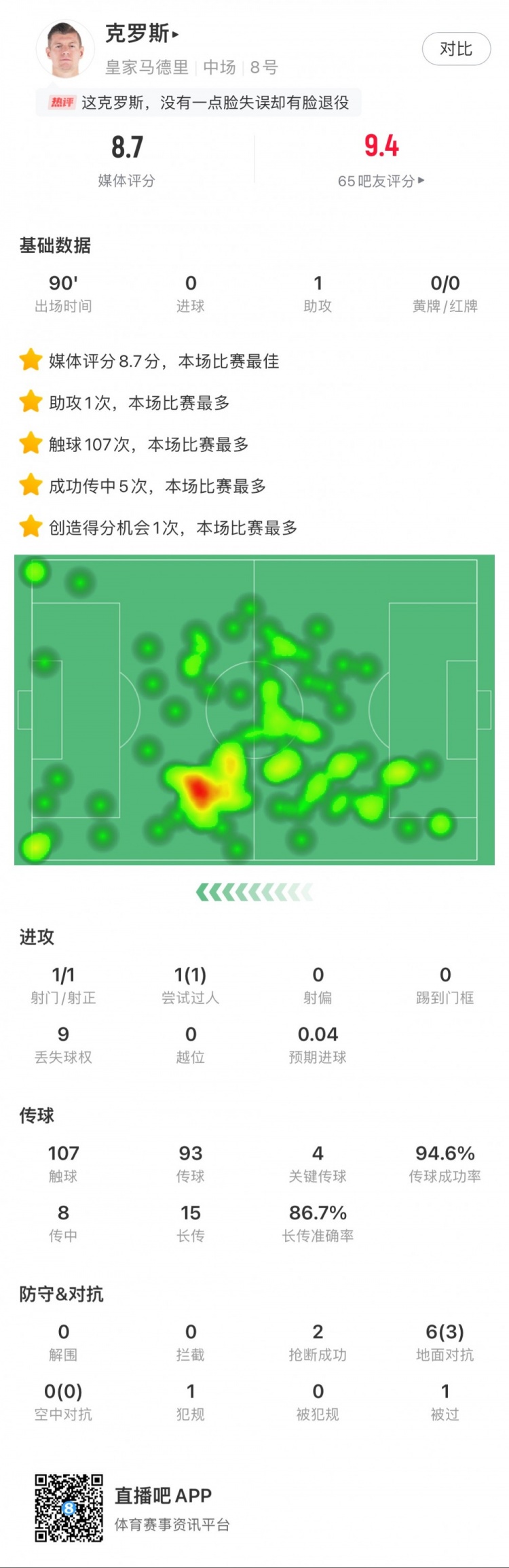 克罗斯全场数据:1次助攻,4次关键传球,15次长传13次到位