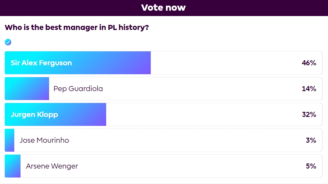 英超官方投票:弗格森46%暂领跑历史最佳主帅,瓜帅14%第3