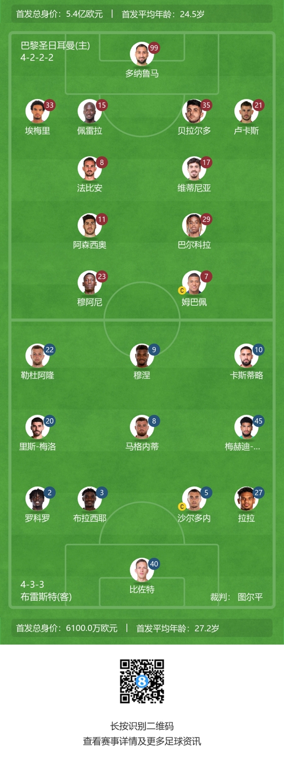 巴黎vs布雷斯特首发:姆巴佩、穆阿尼先发,维蒂尼亚出战