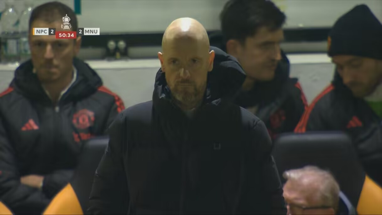 01月29日讯 足总杯曼联vs英乙球队纽波特郡,曼联被扳为2-2时,主场的纽波特郡球迷高声嘲讽滕哈赫:“你明早就下课。”现场镜头可以看到,滕哈赫表情非常严峻。