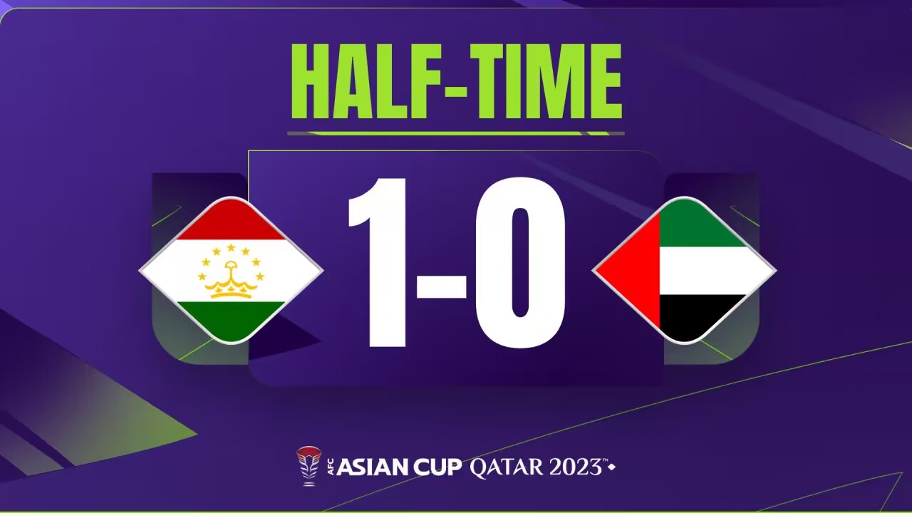 伤停补时7分钟。半场比赛结束,阿联酋0-1塔吉克斯坦。