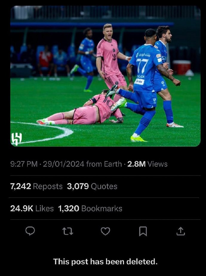1月30日讯 利雅得新月在友谊赛4-3击败迈阿密国际,上半场两球领先时,新月官推曾晒出一张梅西倒地的照片,并配文:没事的莱奥....你不是第一个。不过赛后翻看新月