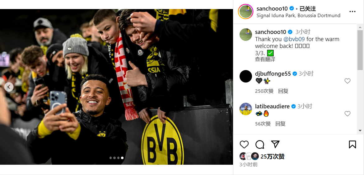 回归后主场首秀&多特三连胜,桑乔晒照致谢球队和球迷