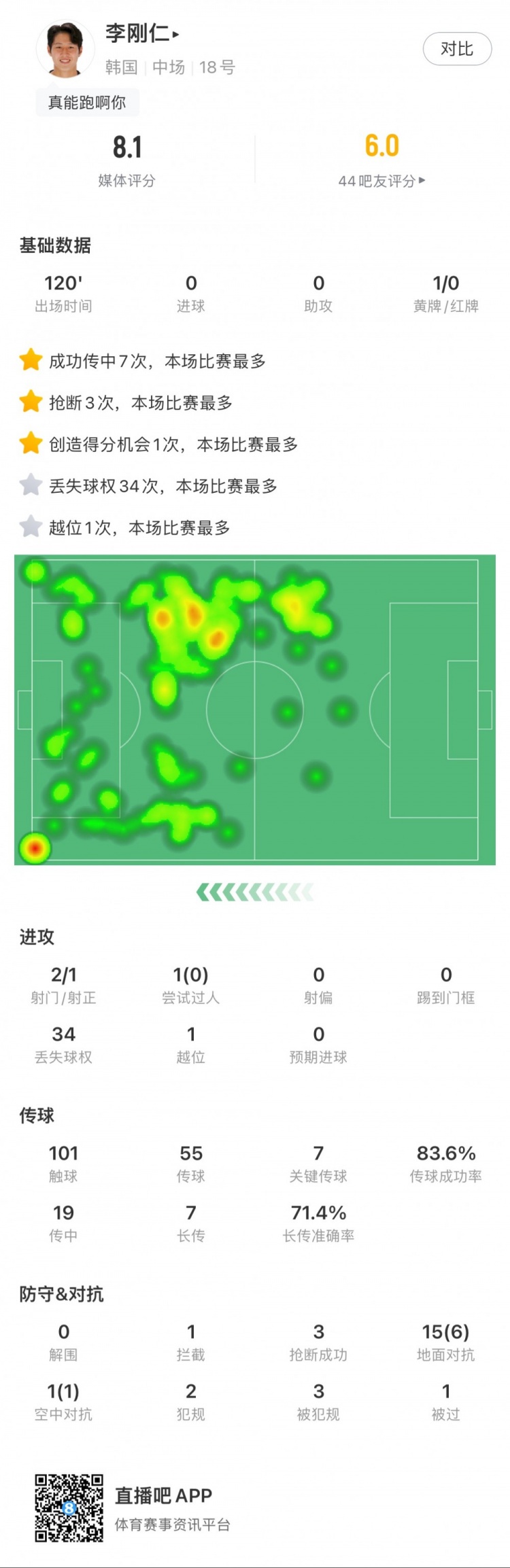 1月31日讯 亚洲杯16强战,韩国队经过点球大战淘汰沙特,晋级八强。李刚仁全场数据:2次射门1次射正101次触球传球成功率84%7次关键传球19次传中7次到位7次长传5