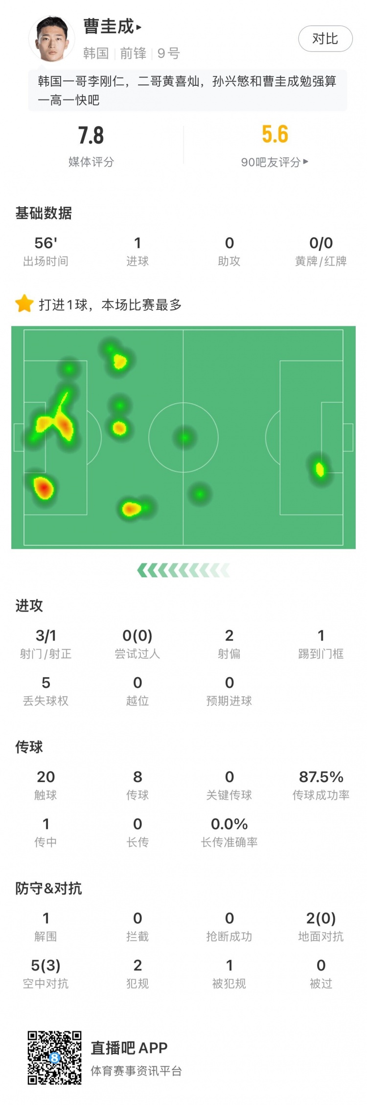 曹圭成本场数据:头球绝平&1次中框,评分7.8分