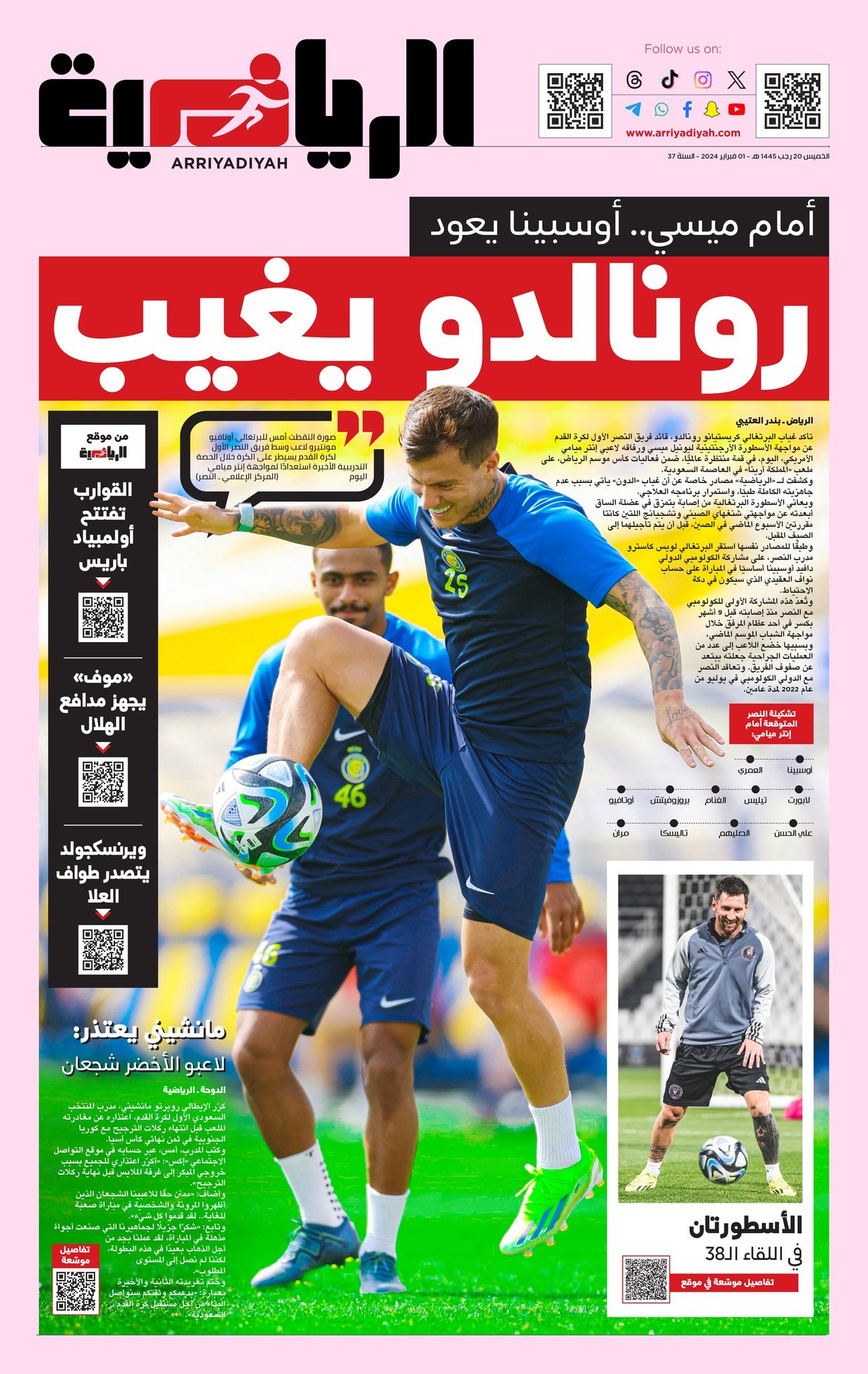 02月01日讯 据沙特媒体arriyadiyah披露,C罗腿部肌肉撕裂,不会参加明日凌晨2点与梅西的直接对话。