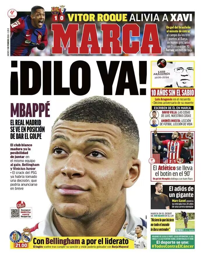 02月01日讯 马卡报今日头版,姆巴佩是封面人物,马卡透露姆巴佩可能很快宣布未来!