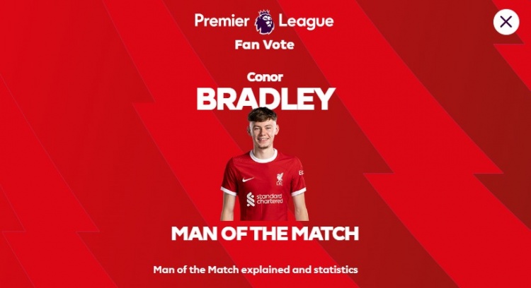 2月1日讯 本轮英超焦点战,利物浦主场4-1切尔西。此役20岁右后卫布拉德利完美发挥1射2传,还有4次关键传球,赛后球员也是当选全场最佳球员。(南川源)