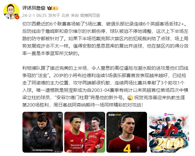 英超第22轮焦点战,利物浦主场4-1击败切尔西,5分优势领跑积分榜。赛后,詹俊对本场比赛进行了点评。詹俊说:“切尔西最近的6个联赛客场输了5场比赛,破俱乐部纪录