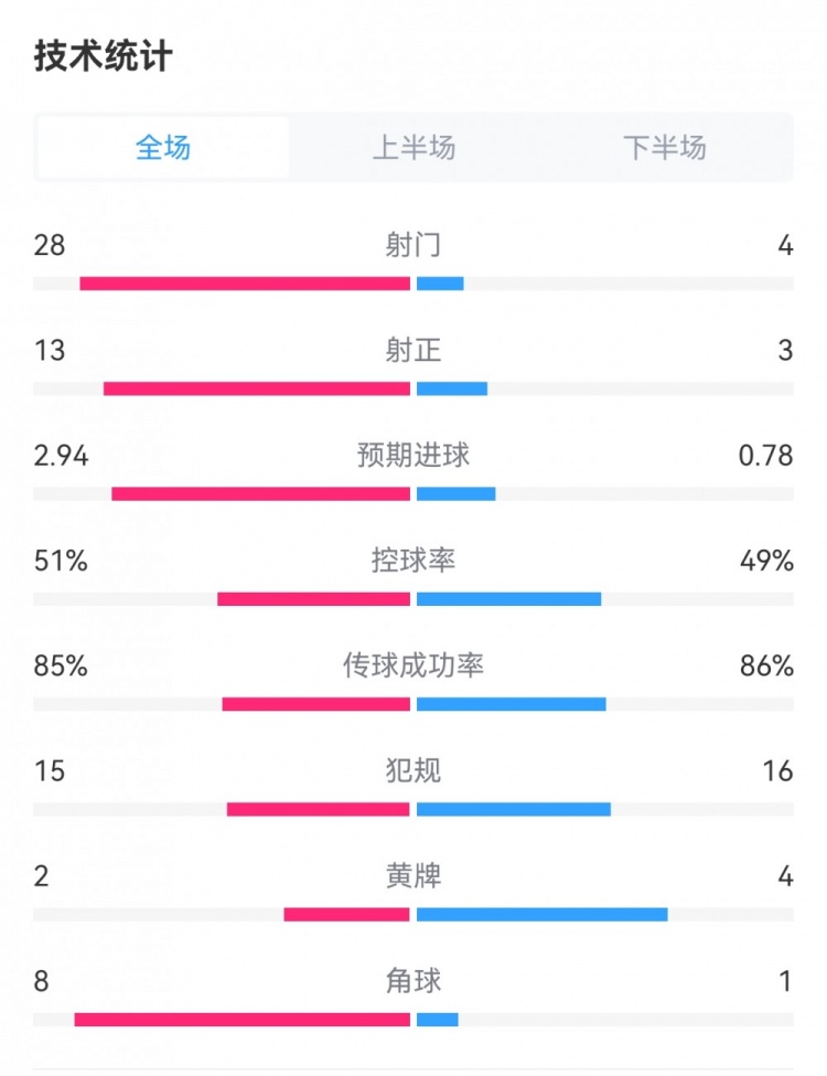 碾压!利物浦4-1切尔西全场数据:射门28-4,射正13-3,角球8-1