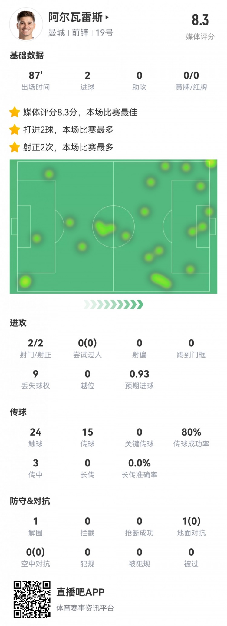 2月1日讯 本轮英超曼城3-0伯恩利,迎来自己24岁生日的阿尔瓦雷斯完美发挥上演梅开二度,球员全场重点数据如下↓2射2正2粒进球预期进球0.9324次触球传球成功率