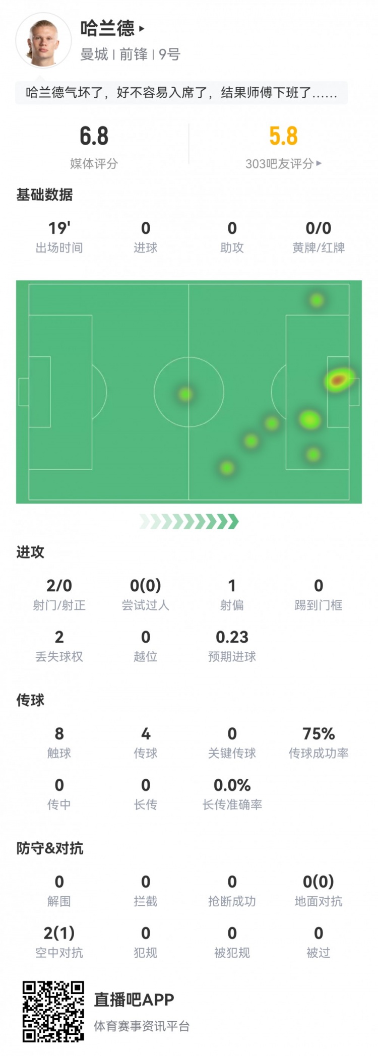 哈兰德复出战数据:出场19分钟2射0正,评分仅6.8分