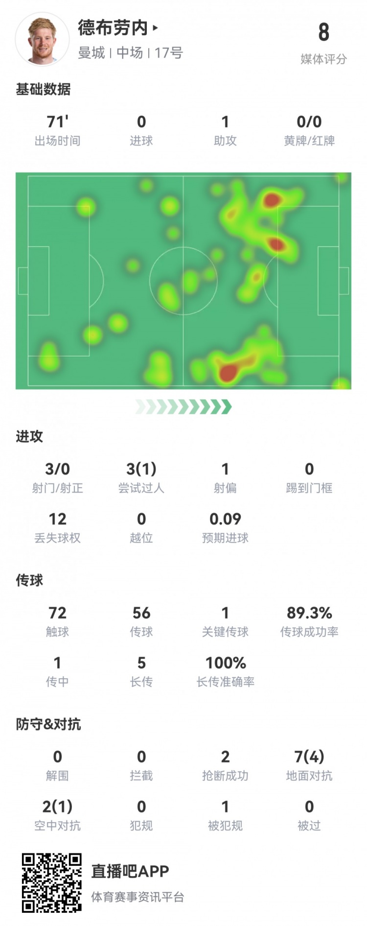 德布劳内本场数据:1次助攻1次关键传球,获评8.0分