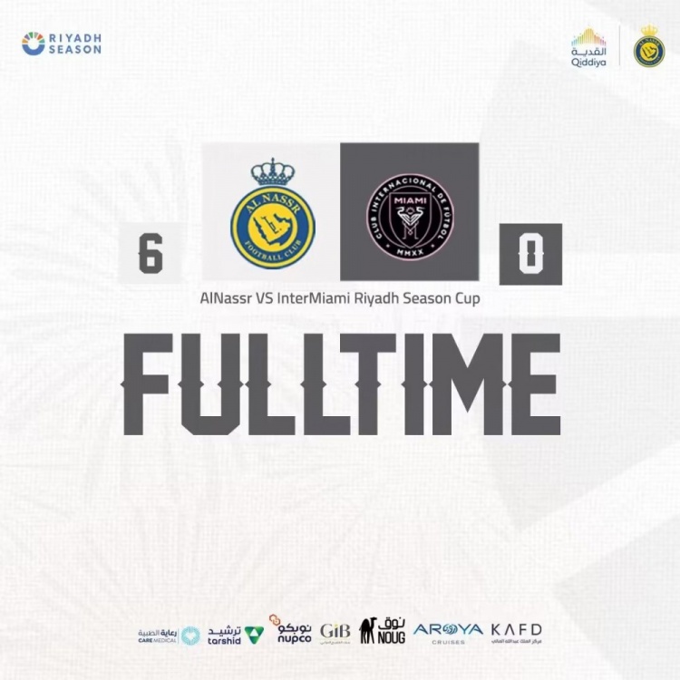 足球友谊赛,利雅得胜利6-0大胜迈阿密国际。上半场,奥塔维奥和塔利斯卡破门,拉波尔特后场吊门进球,布斯克茨染黄;下半场,塔利斯卡帽子戏法,马兰建功,梅西83分钟替补登场。