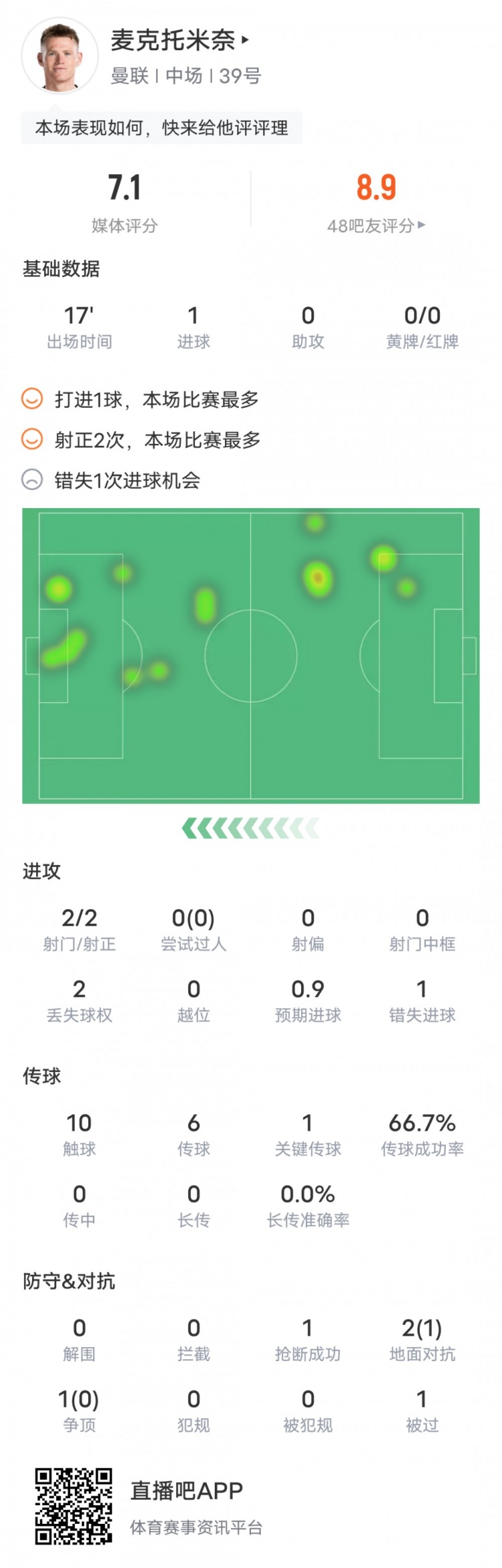 麦克托米奈本场数据:1进球1关键传球1失良机,评分7.1