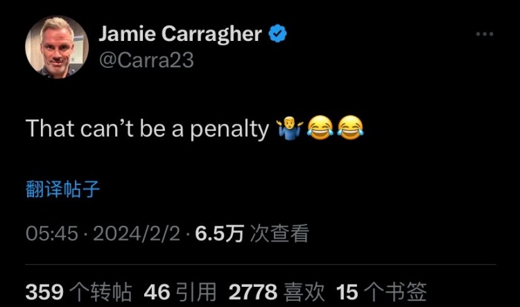 但利物浦名宿卡拉格并不认同这一判罚。他在推特上写道:“这不能是点球