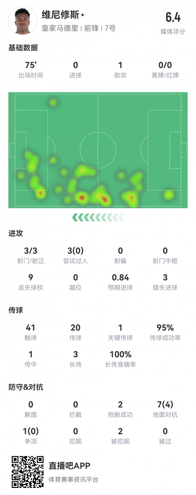 维尼修斯本场数据:1次助攻3次错失良机,获评全队最低6.4分
