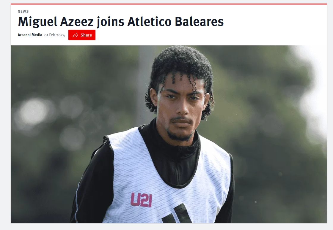 阿森纳公告:米格尔-阿齐兹永久转会加盟西协甲球队巴利阿里竞技。