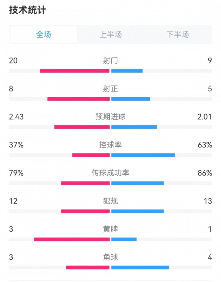 2月3日讯 本轮法甲巴黎2-1斯特拉斯堡。双方全场数据对比如下↓(斯特拉斯堡在前)射门20-9射正8-5预期进球2.43-2.01控球率37%-63%传球成功率79%-86%犯规12-13