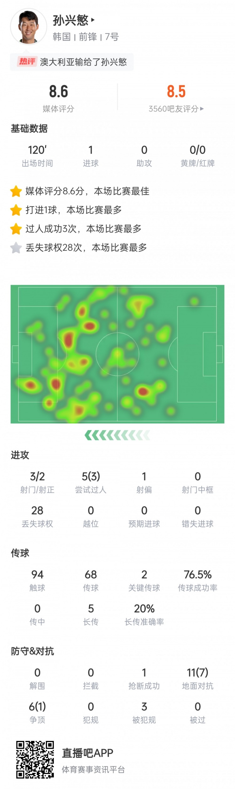 2月3日讯 亚洲杯1/4决赛,韩国队2-1惊险逆转澳大利亚队晋级半决赛。孙兴慜打满全场,他制造了绝平点球,并在加时赛轰入反超比分的任意球世界波。以下为孙兴慜本场数据和评分。