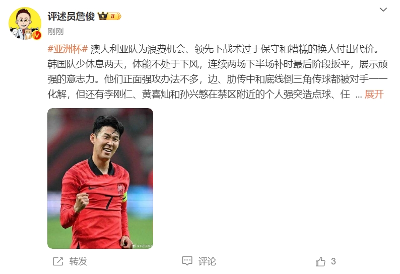 02月03日讯 亚洲杯韩国加时2-1逆转澳大利亚,晋级四强。赛后詹俊发文点评。詹俊:澳大利亚队为浪费机会、领先下战术过于保守和糟糕的换人付出代价。韩国队少