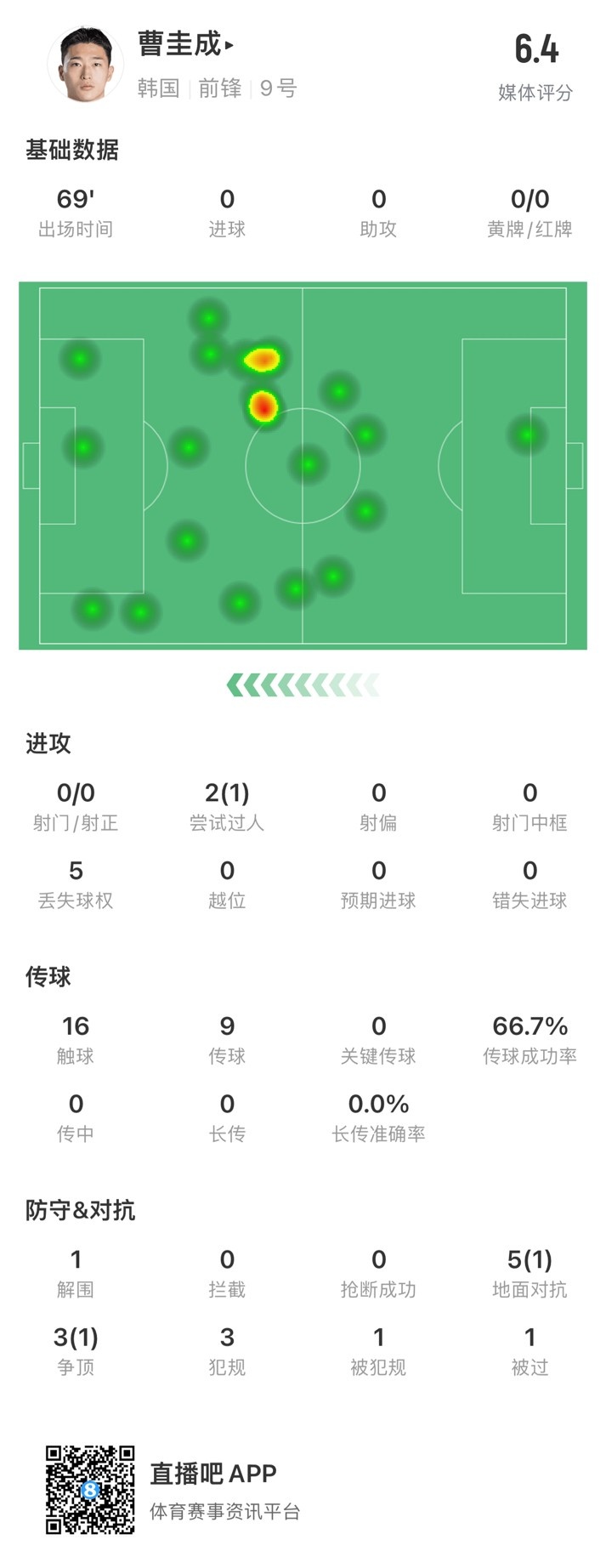 曹圭成数据:出战69分钟0射门,8次对抗成功2次,6.4分全队最低