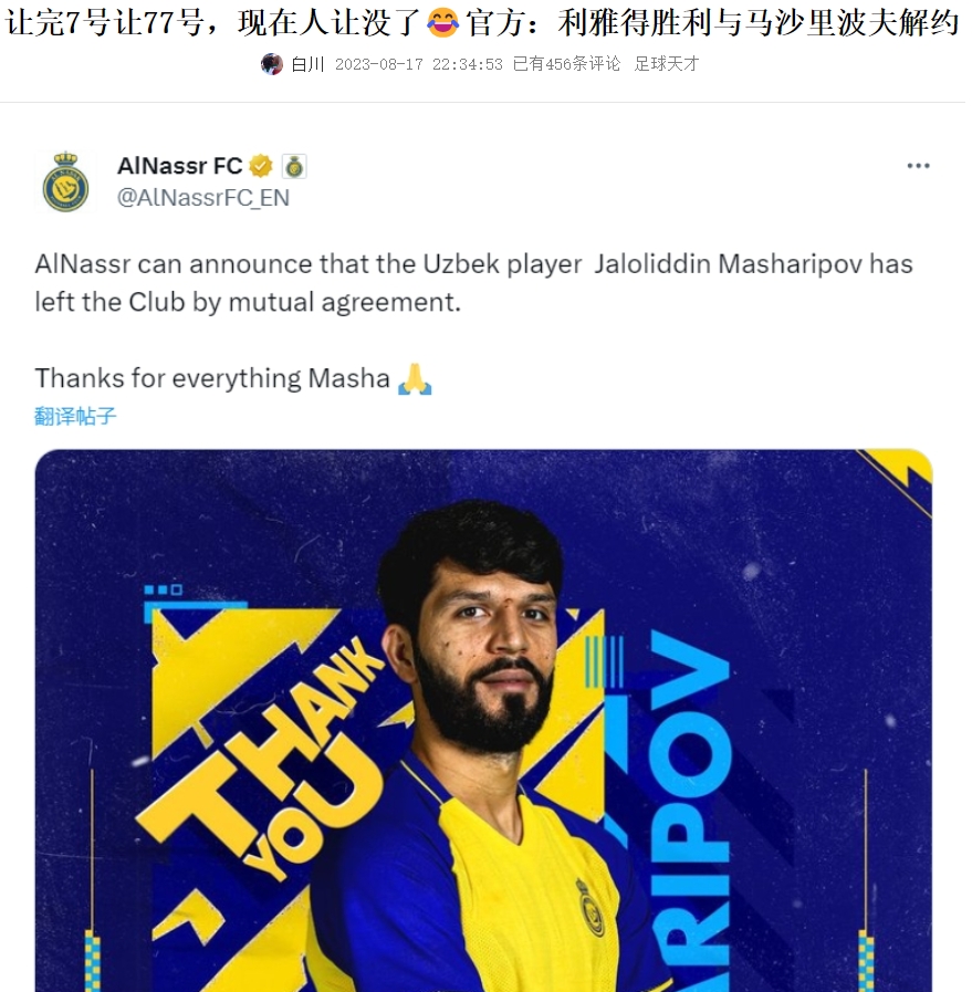 马沙里波夫此前也曾被球迷们知晓,他过去在利雅得胜利效力,曾将7号让给C罗,B罗加盟后他又将77号让出,之后被胜利解约离队。