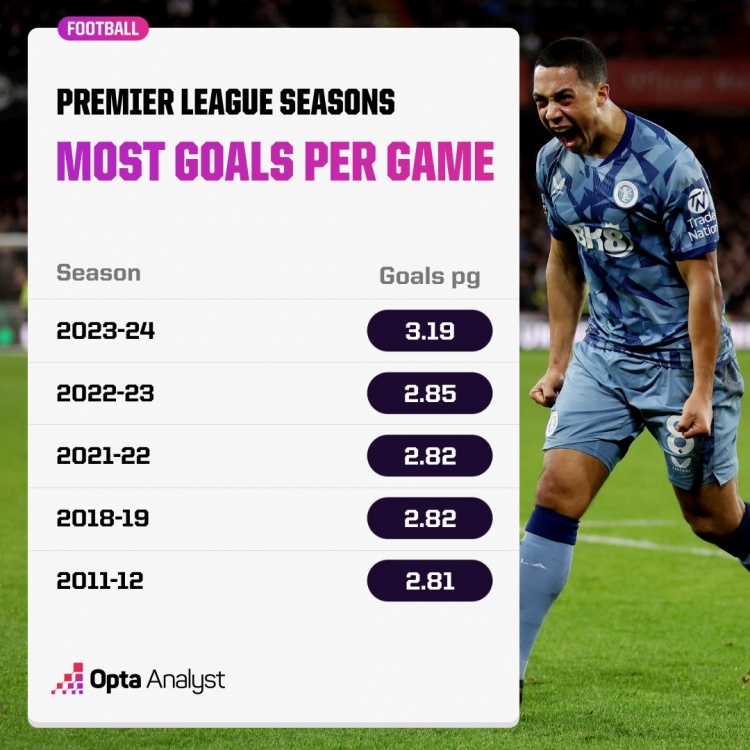 英超本赛季至今场均进3.19球,是英超联赛单赛季历史纪录