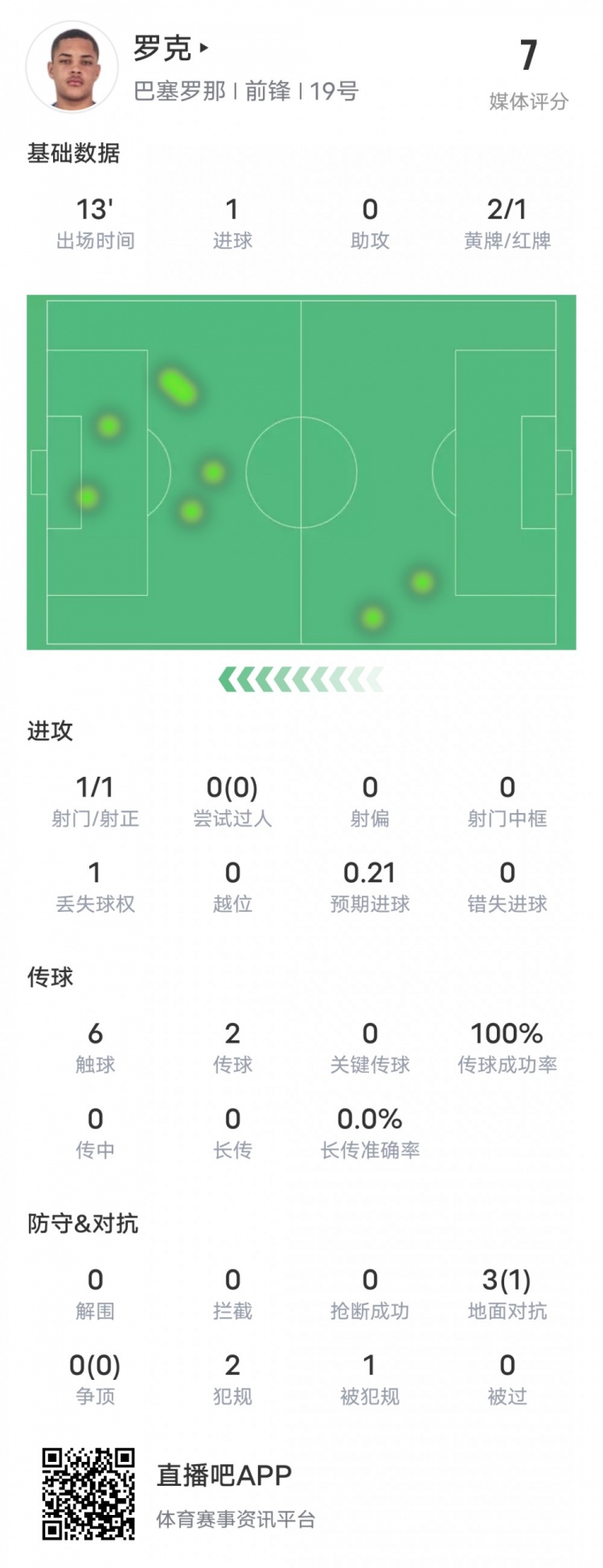 2月4日讯 在对阵阿拉维斯的比赛中,巴萨前锋罗克替补登场打进1球,但在13分钟内两黄变一红被罚下,评分7.0。罗克本场比赛具体数据如下:上场时间13分钟进球1黄牌2