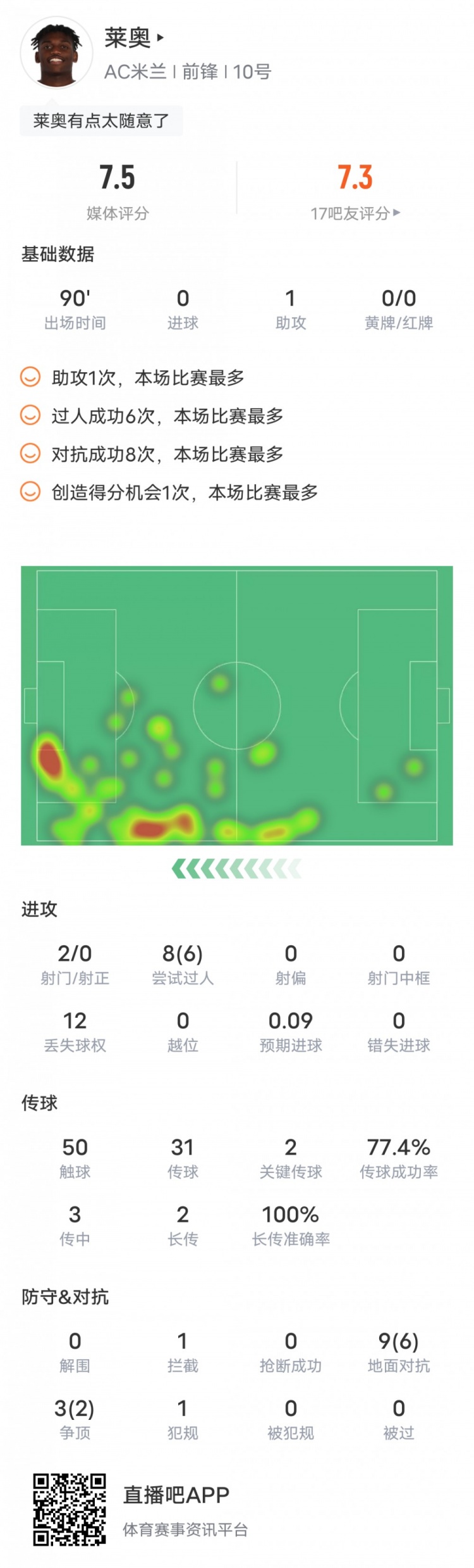 莱奥本场数据:1助攻2关键传球6过人成功,评分7.5