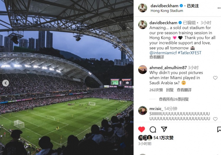 贝克汉姆晒照:太棒了,迈阿密国际在香港的季前训练座无虚席