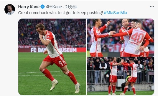 赛后凯恩在社媒发文庆祝:“很棒的逆转取胜,只需要继续努力!”